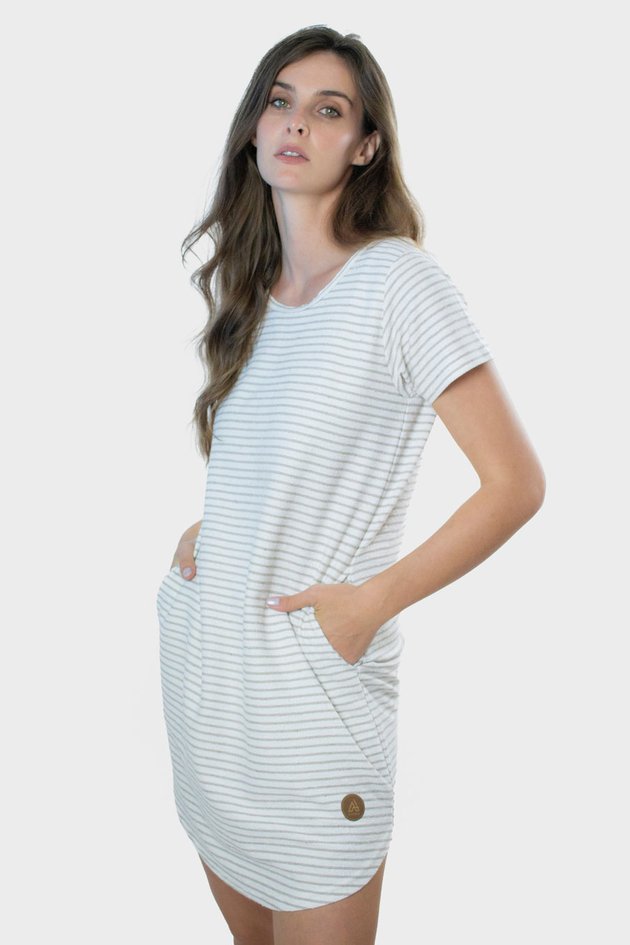 Desenvolvido em uma malha listrada ecologica e com bolso, ele possui bom caimento, tem uma modelagem levemente acinturada e versátil que valoriza todos os tipos físicos.