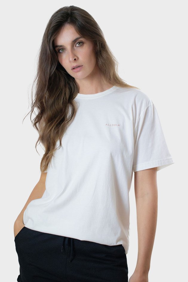 O design clean em tom off white traz o logo Alldeia bordado no peito, reforçando a essência urbana e atemporal da marca.
