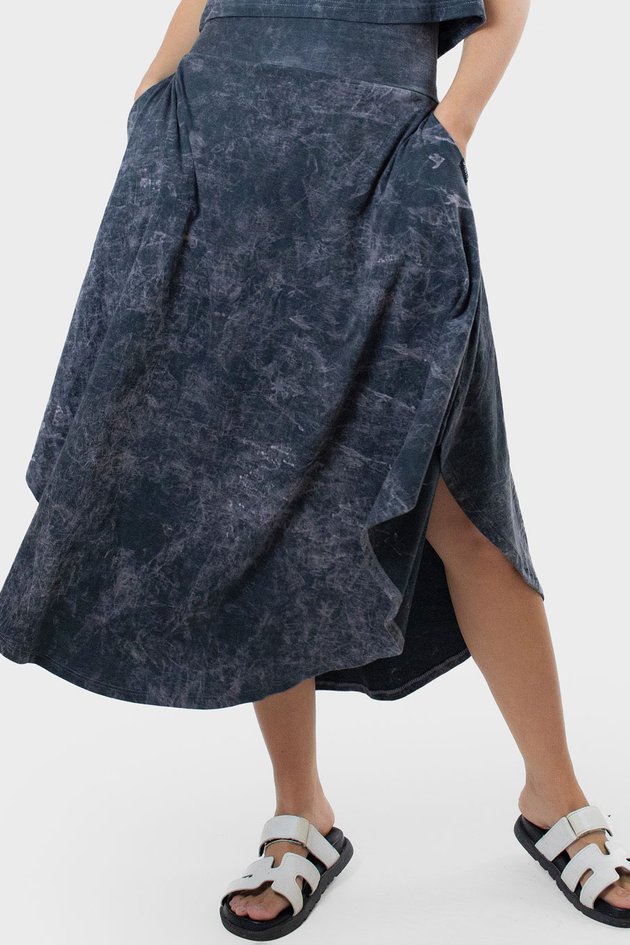 Seus looks com a pegada street que você busca. Nossa saia com lavagem estonada no chumbo possui bolsos e tem modelagem ampla.